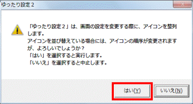- 「「ゆったり設定2」は、画面の設定を変更する際に、アイコンを整列します。」と表示されたときは、デスクトップのアイコンが並び替えられても問題がないことを確認のうえ、「はい」ボタンをクリックしてください。