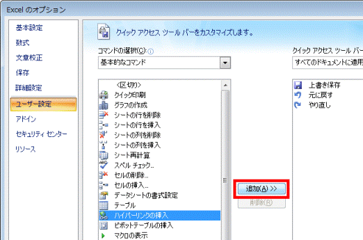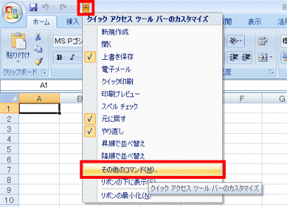 次の手順で、Excel 2007のクイック アクセス ツールバーにコマンドを追加します。