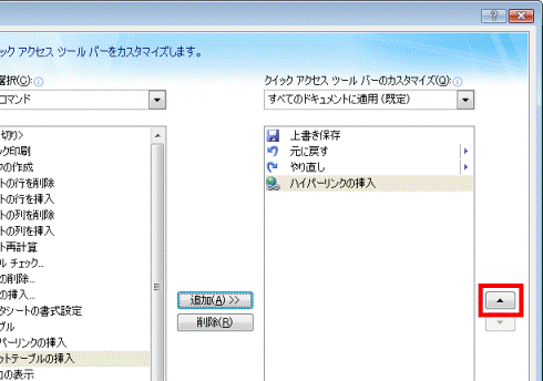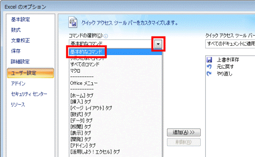 - 「追加」ボタンの右側に、現在クイック アクセス ツールバーに表示されているコマンドの一覧があります。