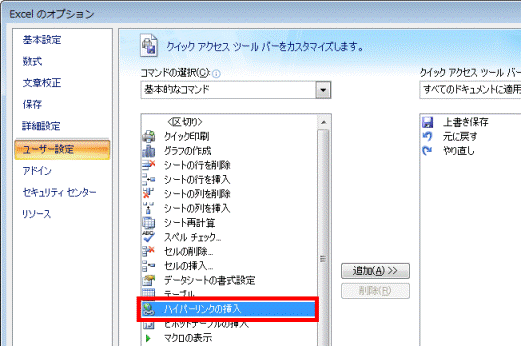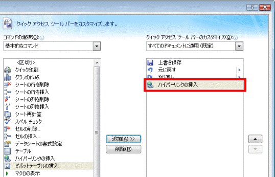 (「ハイパーリンクの挿入」を選択した場合) - 「追加」ボタンをクリックします。