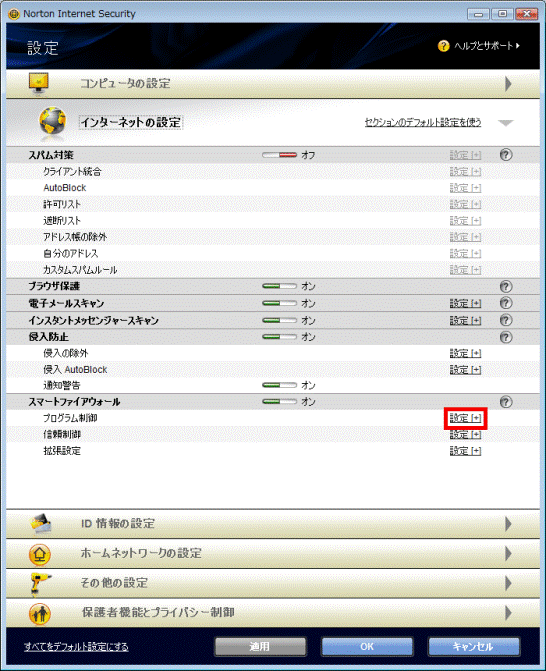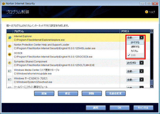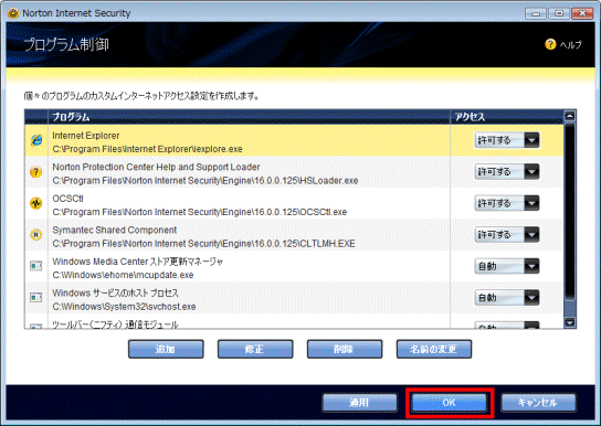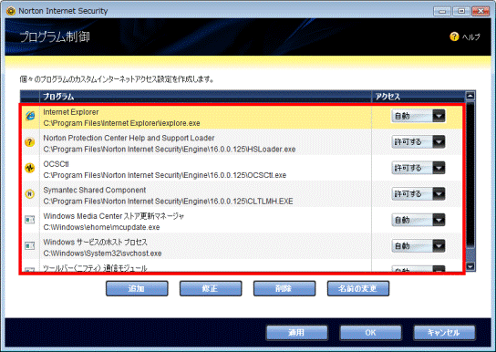 Norton Internet Security 2009のファイアウォール機能では、インターネットアクセスが制御されているプログラムを確認したり、制御の設定を変更したりすることができます。
