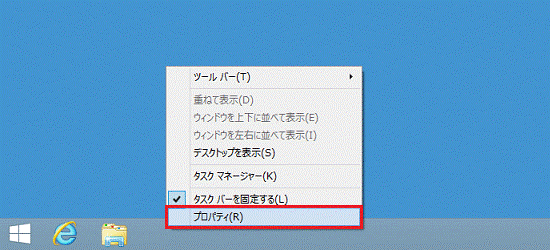 デスクトップが表示されている場合は、次の手順に進みます。 - 画面の下にあるタスクバーの何もないところを右クリックし、表示されるメニューから「プロパティ」をクリックします。