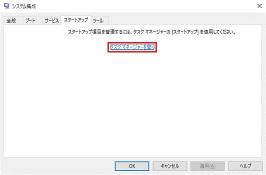 - 「スタートアップ項目を管理するには、タスクマネージャーの [スタートアップ] を使用してください。」と表示されます。