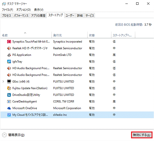 表示されていない場合は、「Softex」から始まる項目のチェックを外してもWindowsの起動に影響はありません。 - 「FJAutoSignIn」のチェックを外すと、自動サインイン設定が使用できなくなります。
