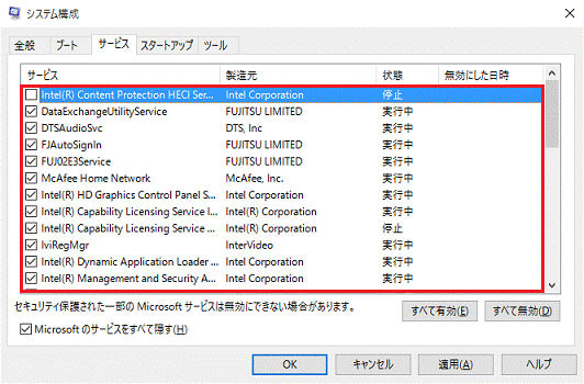 「サービス」の項目から、常駐を解除する項目のチェックボックスをクリックし、チェックを外します。ご注意- 「Softex OmniPass Cachedrv Service」が表示されている場合は、チェックは外さないでください。