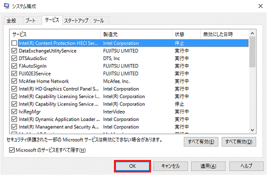 - 「System Configuration」または、「システム構成」の「サービス」タブをクリックします。