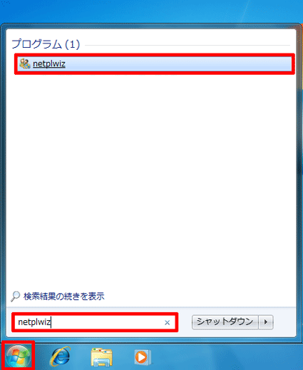 - スタートメニューの検索ボックスに「netplwiz」と入力し、検索結果から「netplwiz」をクリックします。