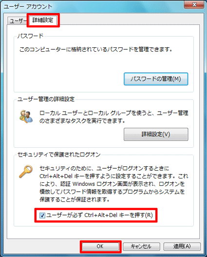 「詳細設定」タブをクリックし、「セキュリティで保護されたログオン」の「ユーザーが必ずCtrl+Alt+Delキーを押す」をクリックしチェックを付けて、「OK」ボタンをクリックします。