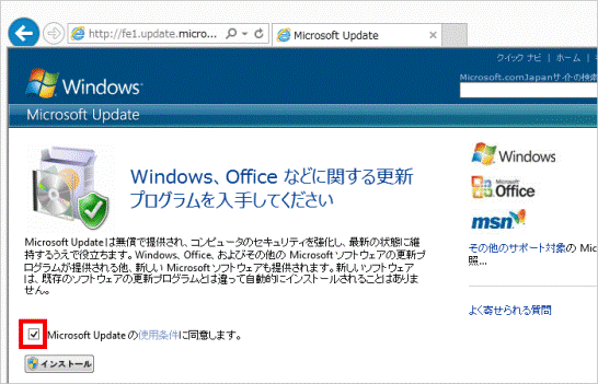 「使用条件」のリンクをクリックして表示される「使用条件」の内容をよく確認し、同意する場合は「Microsoft Updateの使用条件に同意します。」のチェックボックスをクリックしてチェックを付けます。