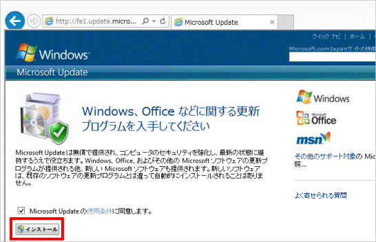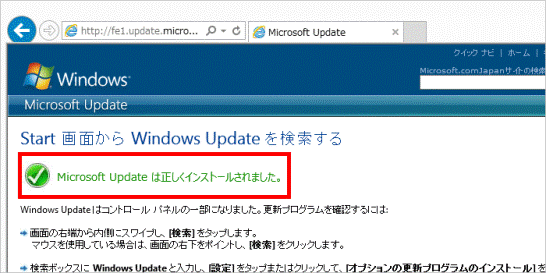 以降の手順を実施する必要はありません。 - Internet Explorerが起動し、Microsoft Updateのページが表示されます。