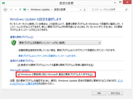 「取得する更新プログラム」に「Microsoft UpdateからのWindowsと他の製品」と表示されている場合は、すでにMicrosoft Updateが有効に設定されています。