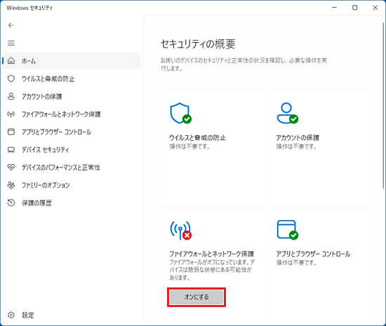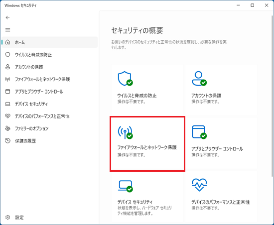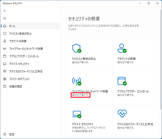 「はい」ボタンをクリックします。 - 「ファイアウォールとネットワーク保護」の項目が「操作は不要です。」と、表示されたことを確認します。