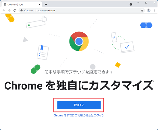 - インストールが終わると、Google Chrome ブラウザが起動し、「Chromeを独自にカスタマイズ」と表示されます。
