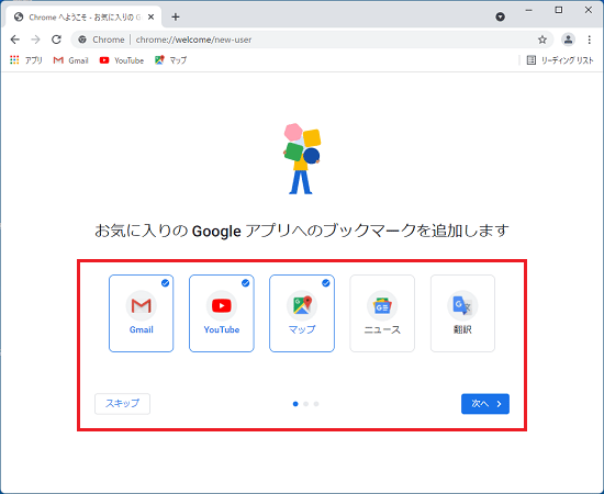 「スキップ」ボタンをクリックするか、Google Chrome ブラウザに追加するアプリのブックマークを選択し、「次へ」ボタンをクリックします。