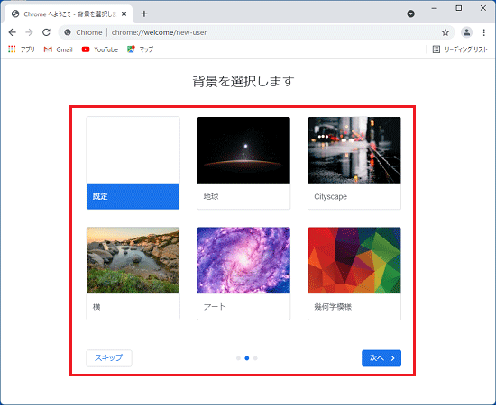 「スキップ」ボタンをクリックするか、Google Chrome ブラウザの背景を選択し、「次へ」ボタンをクリックします。