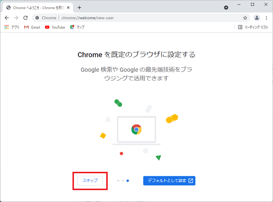 アドバイスGoogle Chrome ブラウザを既定のブラウザに設定する場合は、「デフォルトとして設定」ボタンをクリックし、表示された画面から設定してください。