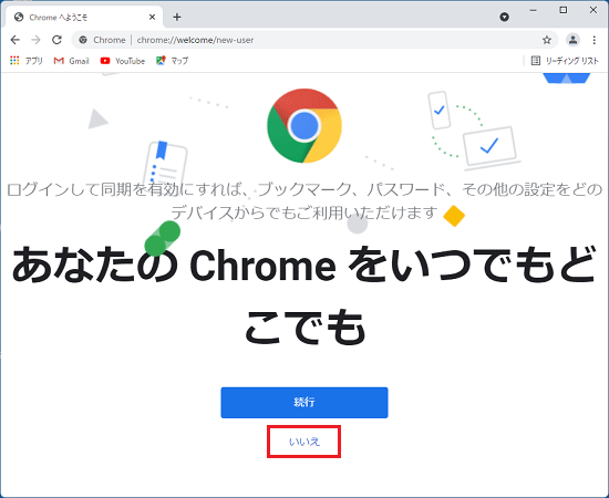 アドバイスGoogle アカウントをお持ちで、Google Chrome ブラウザにログインしたい場合は、「続行」ボタンをクリックし、表示された画面から設定してください。