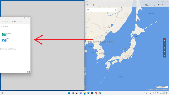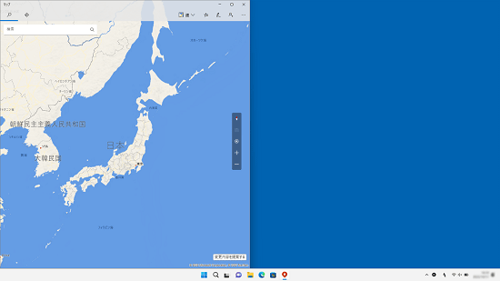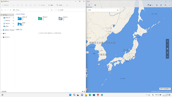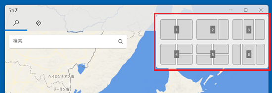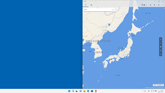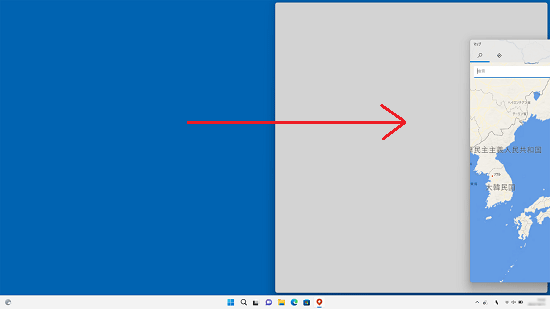 ここでは例として、「マップ」を起動します。 - アプリの画面上端をドラッグし、2分割で表示したい場合は画面の左右の端に、4分割で表示したい場合は画面の四隅のいずれかにマウスポインターを移動します。