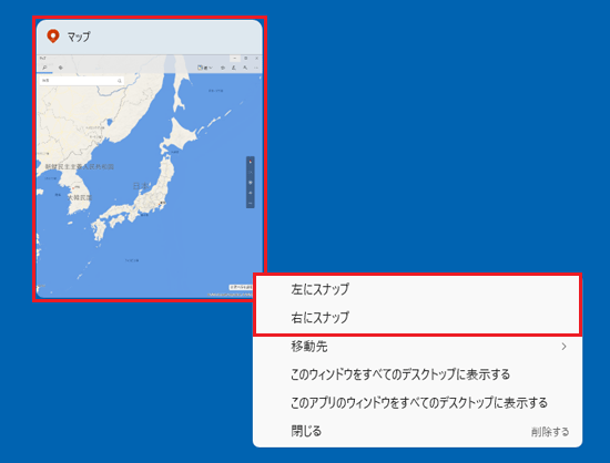 分割したいアプリを右クリックし、手順3.と反対の「左にスナップ」もしくは「右にスナップ」をクリックします。