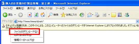 - 「セキュリティ保護のため、このサイトによる、このコンピュータへのファイルのダウンロードがInternet Explorerによりブロックされました。」をクリックし、表示されるメニューから「ファイルのダウンロード」をクリックします。