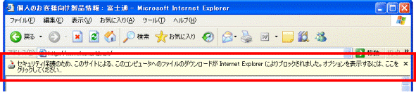 「セキュリティ保護のため、このサイトによる、このコンピュータへのファイルのダウンロードがInternet Explorerによりブロックされました。オプションを表示するには、ここをクリックしてください。」