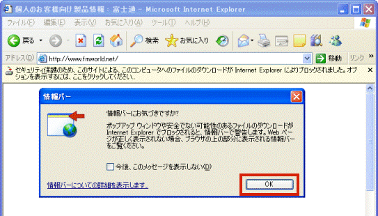 「情報バーにお気づきですか?」と表示された場合は、「OK」ボタンをクリックします。