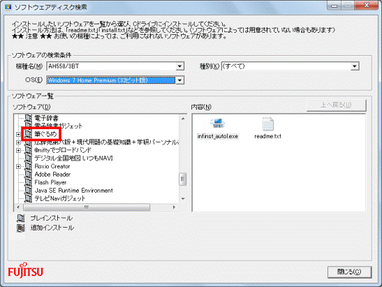 [Windows 7] 32ビットと64ビットのどちらのシステムがインストールされているのかを確認する方法を教えてください。(新しいウィンドウで表示) - 「ソフトウェア」欄にある、「筆ぐるめ」をクリックします。