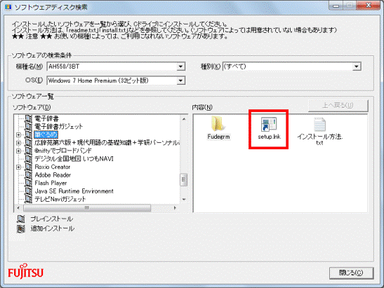- 「内容」欄にある、「setup.lnk」をダブルクリックします。