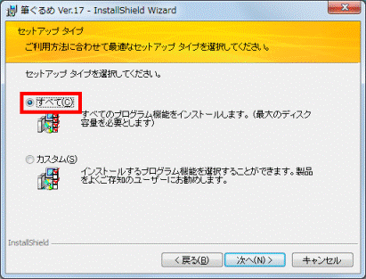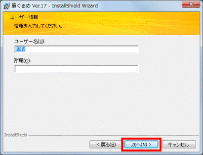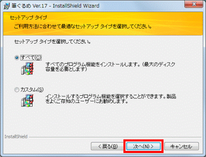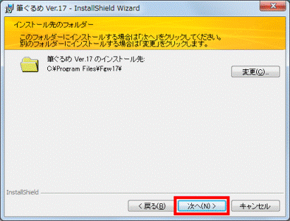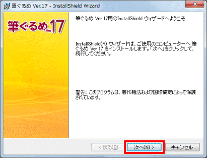 - 「筆ぐるめ Ver.17用のInstallShield ウィザードへようこそ」と表示されます。