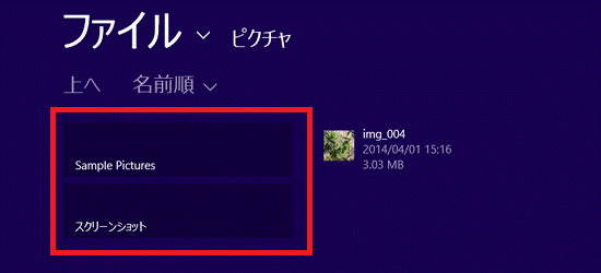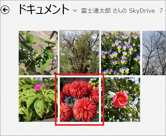 デスクトップの場合は、画面の右下にマウスポインターを移動し、チャームが表示されたら「スタート」をクリックします。 - 「ドキュメント」など、SkyDriveにあるフォルダーが表示されます。