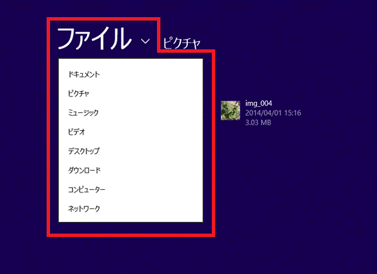 「ファイル」をクリックし、表示されるメニューから、ダウンロード先のフォルダーをクリックして選択します。