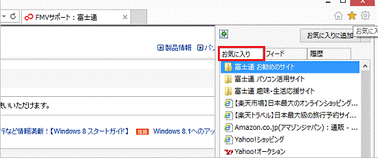 Internet Explorer 11では、「お気に入り」(星のボタン)をクリックすると、お気に入りが表示されます。