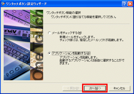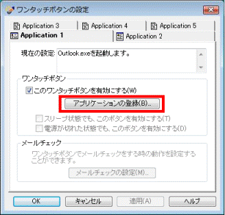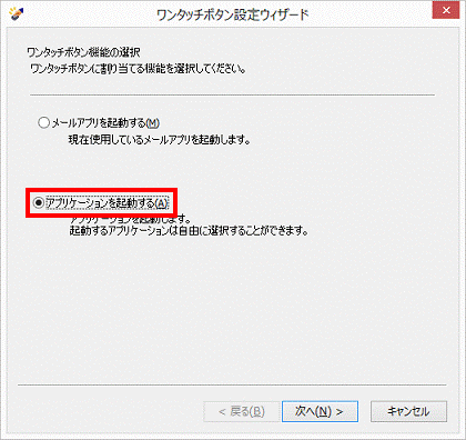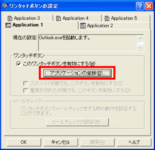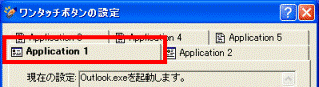 「E-mail」タブが表示されていない場合は、「Application 1」タブをクリックします。 - 「このボタンの動作を指定してください」の「▼」ボタンをクリックし、表示される一覧から「その他のアプリケーションを起動」をクリックします。