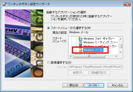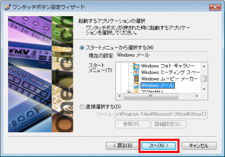 (「Windows メール」をクリックした例) - 「次へ」ボタンをクリックします。