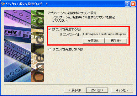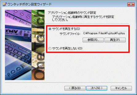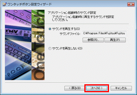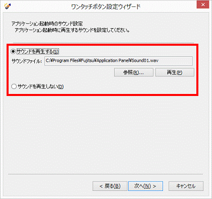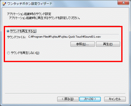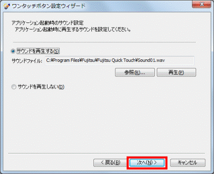 音を鳴らす設定にした場合は、「参照」ボタンをクリックし、アプリケーションを起動したときの音をお好みの音に設定できます。 - 「次へ」ボタンをクリックします。