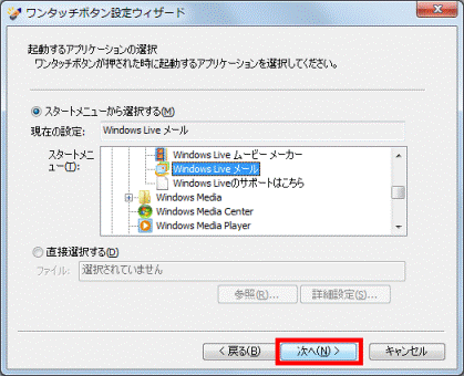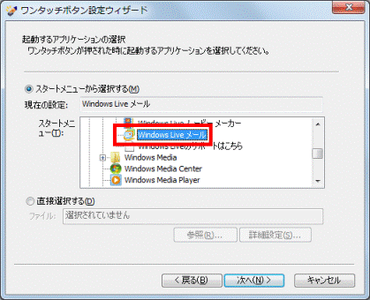 (「Windows Live メール」をクリックした例) - 「次へ」ボタンをクリックします。
