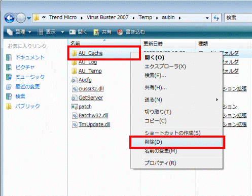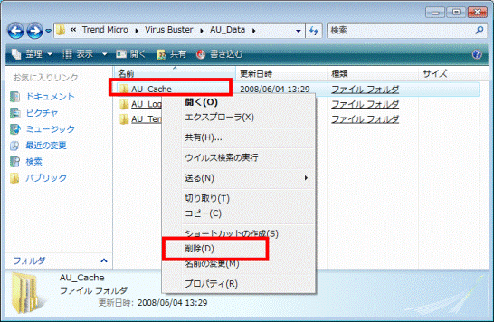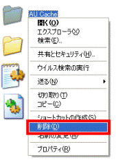- 「AU_Cache」フォルダを右クリックし、表示されるメニューから、「削除」をクリックします。