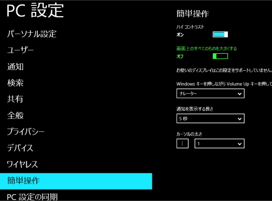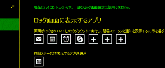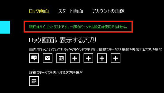 ハイコントラストの設定をオンにすると、「ロック画面」や「スタート画面」の変更など、一部の設定が使用できなくなります。