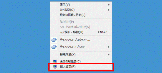 - デスクトップの何もないところで右クリックし、表示されるメニューから「個人設定」をクリックします。