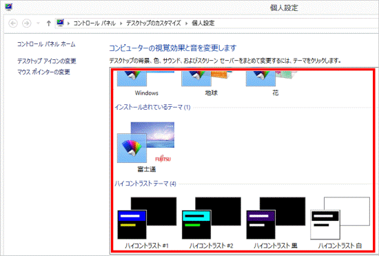 「Windows の標準のテーマ」または「インストールされているテーマ」から、お好みのテーマをクリックします。アドバイス「インストールされているテーマ」の「富士通」をクリックすると、購入時の状態に戻ります。