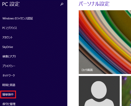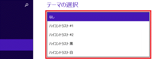 その場合は、それぞれの設定方法で、ハイコントラストの設定をオフにして、通常の表示に戻るかどうかを確認してください。 - ハイコントラストの設定をオンにすると、「ロック画面」や「スタート画面」の変更など、一部のパーソナル設定が使用できなくなります。