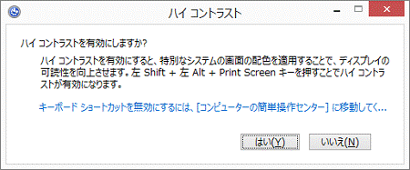 左側の【Shift】キーと左側の【Alt】キーを押しながら、【PrtSc】キー押すことでも、ハイコントラストのオン / オフを切り替えられます。