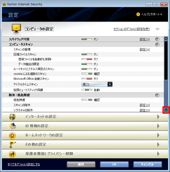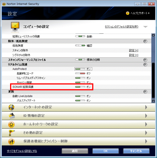 「オフ」の場合は、「オフ」をクリックし「オン」に切り替えます。 - 「SONAR拡張保護」が「オン」に設定されていることを確認します。
