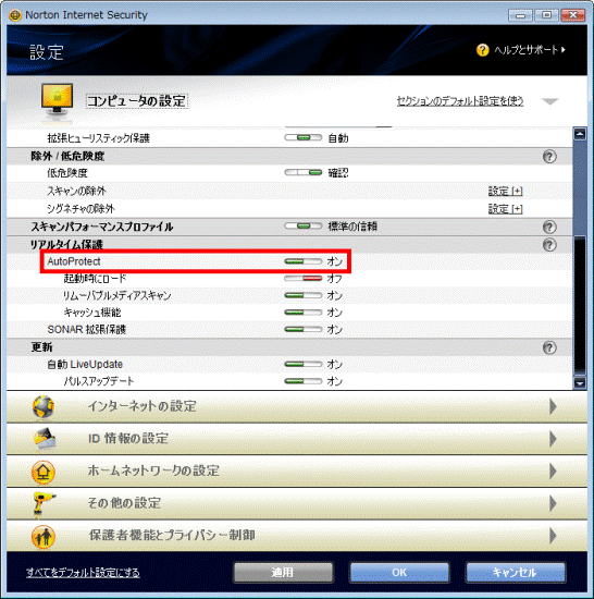 - 「リアルタイム保護」欄の「AutoProtect」が「オン」に設定されていることを確認します。