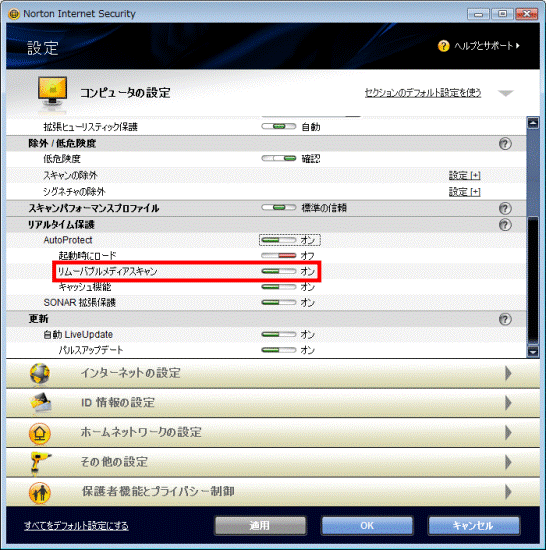 「オフ」の場合は、「オフ」をクリックし「オン」に切り替えます。 - 「リムーバブルメディアスキャン」が「オン」に設定されていることを確認します。