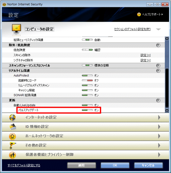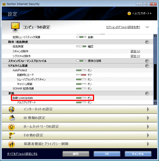 「オフ」の場合は、「オフ」をクリックし「オン」に切り替えます。 - 「更新」欄の、「自動 LiveUpdate」が「オン」に設定されていることを確認します。