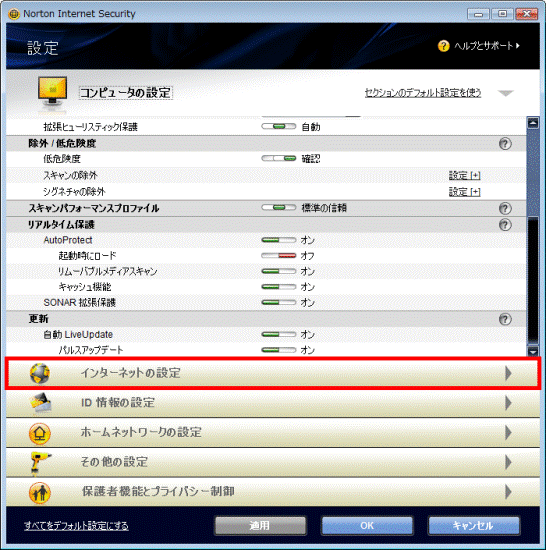 「オフ」の場合は、「オフ」をクリックし「オン」に切り替えます。 - 「インターネットの設定」をクリックします。