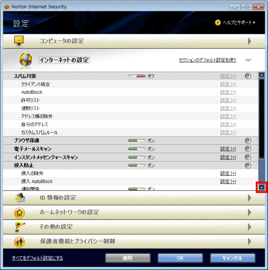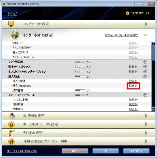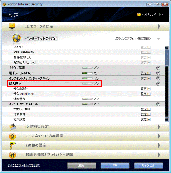 「インターネットの設定」の右側にある「▼」ボタンをクリックし、「侵入防止」の項目を表示します。