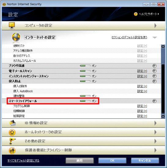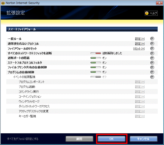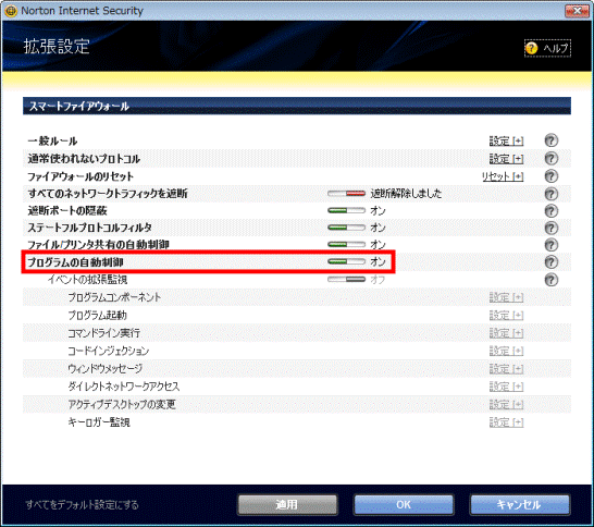 - 「プログラムの自動制御」を「オフ」にすると、重要なプログラムや機能を遮断することがあるため、初期設定の状態では「オン」に設定されています。