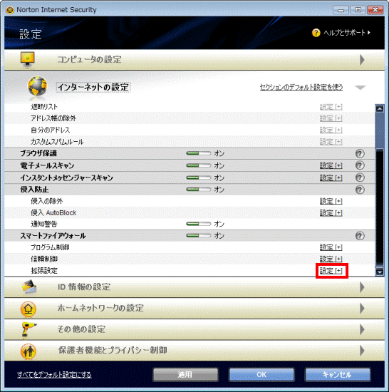 「オフ」の場合は、「オフ」をクリックし「オン」に切り替えます。 - 「拡張設定」の右側にある「設定 [+]」をクリックします。